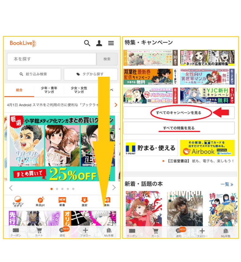 ブックライブのクーポンは、トップページ下にスクロールすると出てくる「特集・キャンペーン」の「すべてのキャンペーンを見る」→「一覧」→「全て」→「クーポン」から確認できます。
