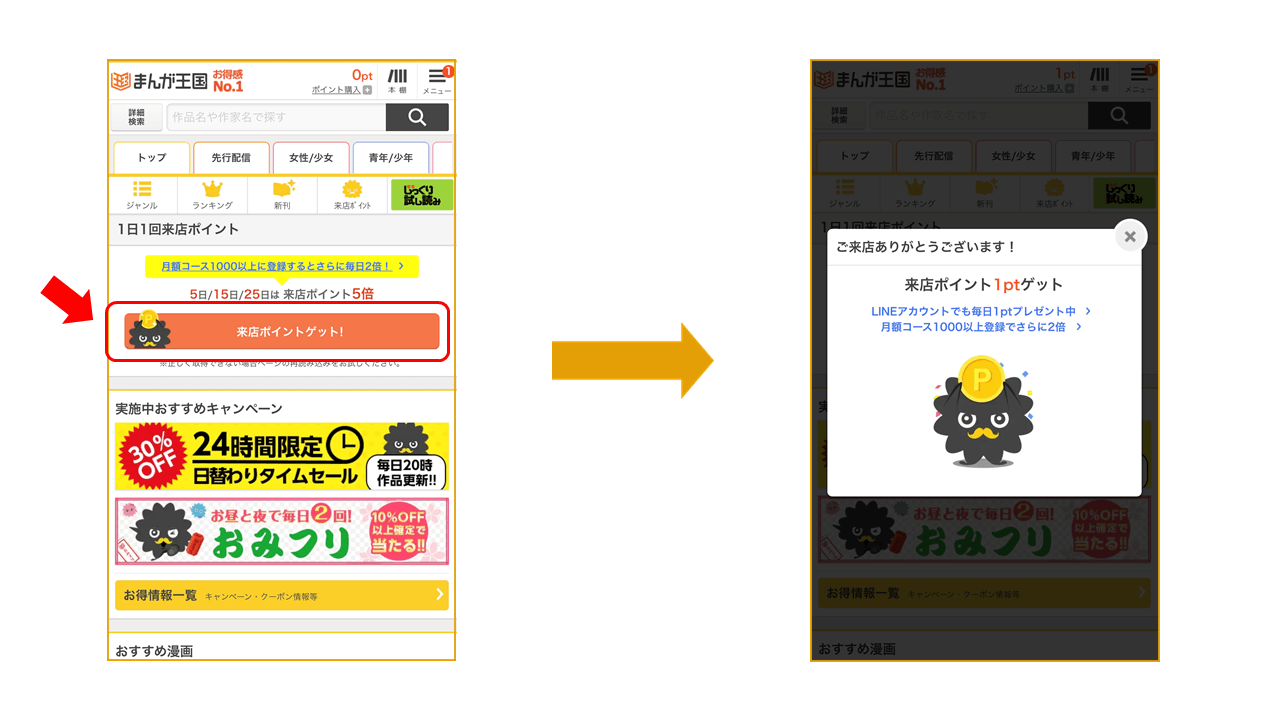 まんが王国では、1日1回ログインすると来店ポイントを1ptゲットできます。