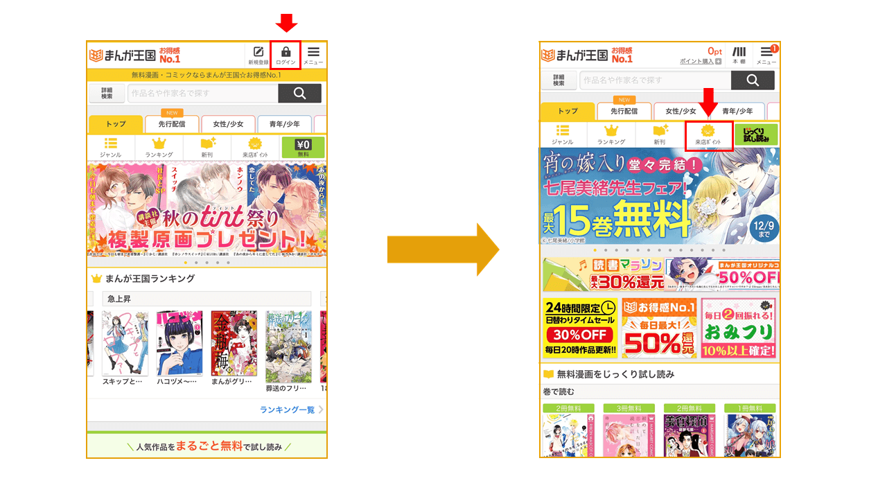 まんが王国にログインし、トップページから「来店ポイント」というバナーを選択します。