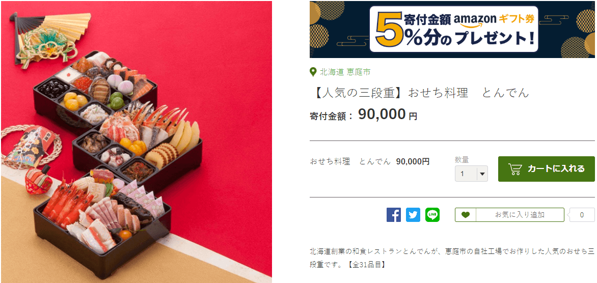 こちらは北海道恵庭市の返礼品で、北海道で創業した和食レストラン「とんでん」が恵庭市の自社工場で作った人気のおせちです。