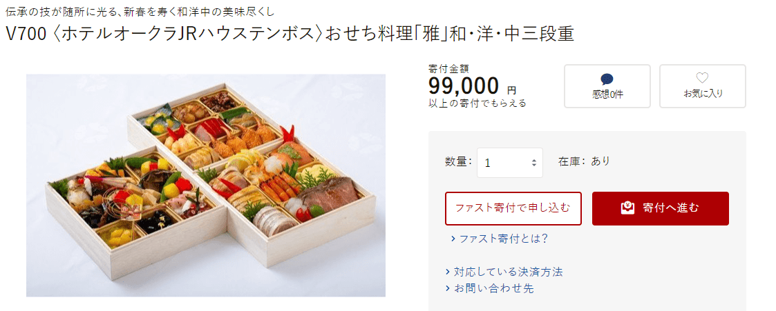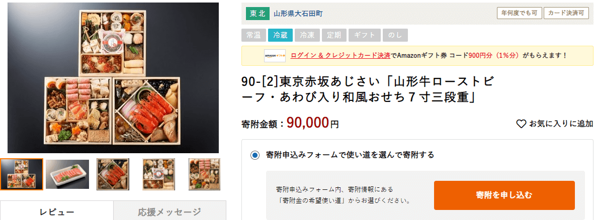 41品目からなる7寸の三段重です。お重は折箱に入れられ、さらに風呂敷で包まれて届くので、とても高級感があります。およそ4~5人前ですので、元旦に親戚などがきても大丈夫な量です。寄付金額9万円以上で、到着予定日は12月31日です。