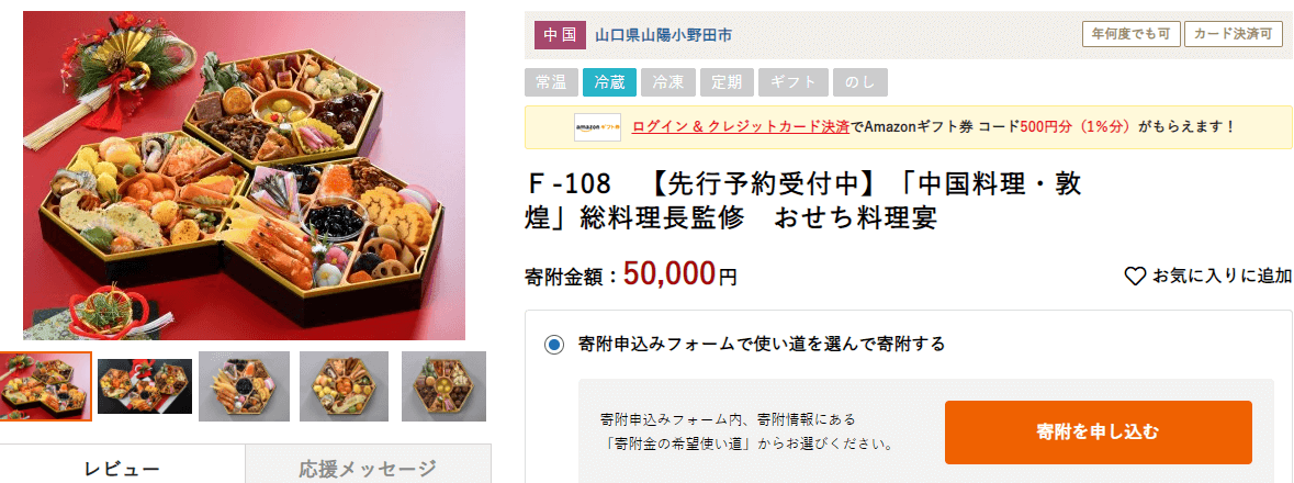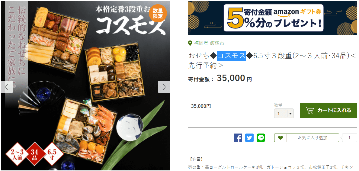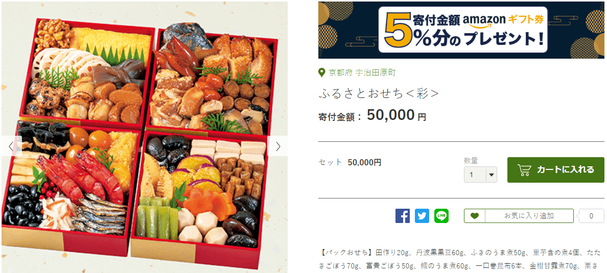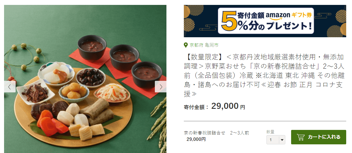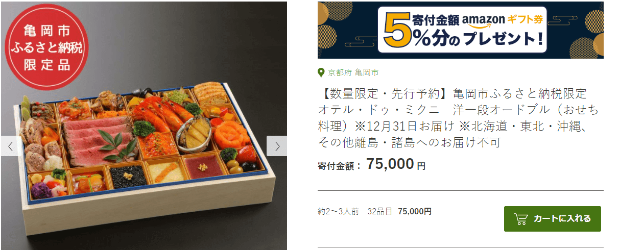 寄付金額は7万5,000円以上です。2~3人前で、全32品目が盛りつけられています。12月31日の到着ですが、北海道や東北、沖縄には発送できないため注意が必要です。