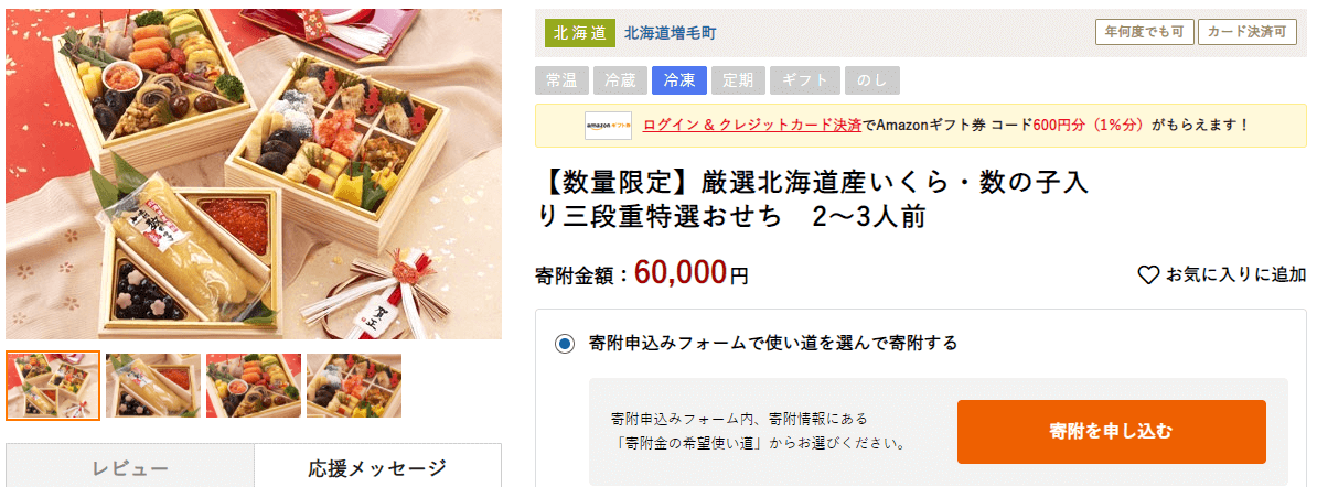 寄付金額は6万円以上です。到着予定日は2020年の12月29日もしくは30日なので、2021年の元旦に間に合います。2~3人前なので、夫婦や、夫婦と子ども1人の3人家族におすすめです。
