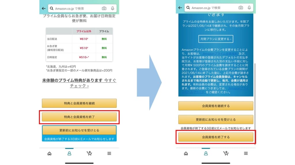 - [プライム会員資格を終了し、特典の利用を止める]を選択