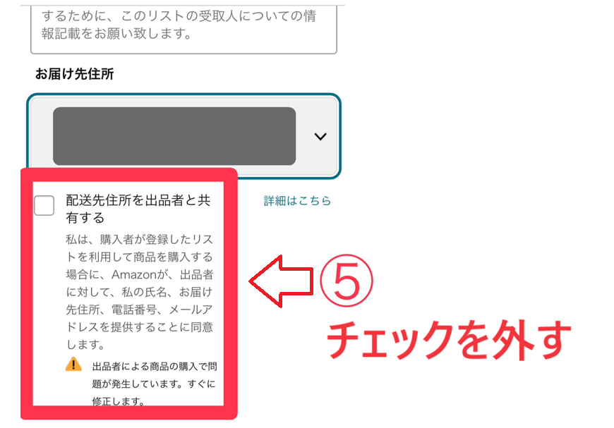 「配送先住所を出品者と共有する」のチェックを外す