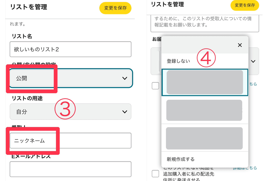リストの設定からリスト名・公開/非公開の選択・リストの用途・受取人名(本名でなくてOK)・Eメールアドレス・誕生日・内容・お届け先住所の設定が可能なので、詳細に設定される方はぜひ参考にしてみてください。