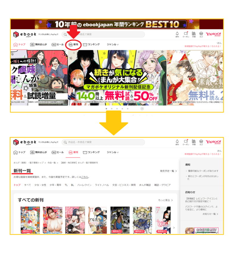その他にも、新刊の作品を探したい場合は、トップページにある「新刊」から新刊一覧を見ることができます。