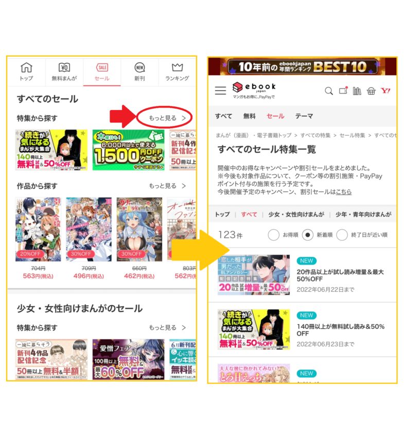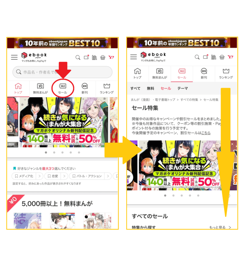 ebookjapanのお得なクーポンやセールはトップページにある「セール」から簡単に探すことができます。トップページの「セール」をタップすると、セール特集ページに移ります。下にスクロールすると現在開催されているセールやクーポンがずらりと表示されています。