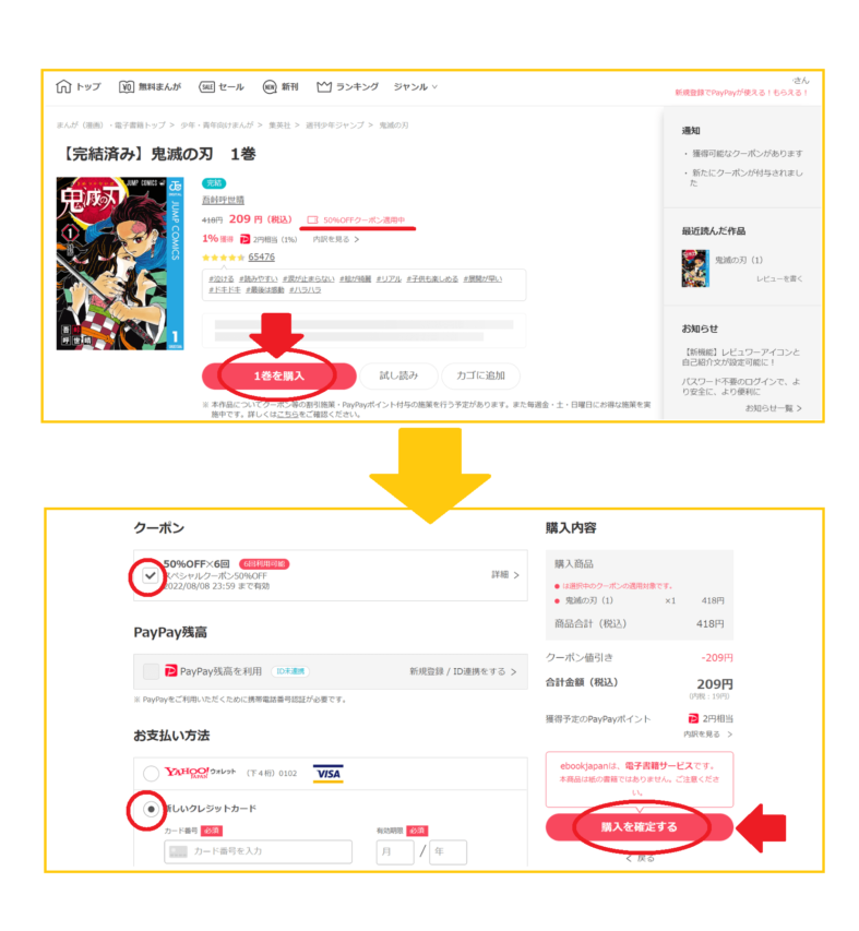 本の購入画面に移るので、使用したいクーポンがあればチェックを付け、支払いたい方法にチェックを付けます。クレジットカードで支払う場合等、カード番号など必要事項を入力します。