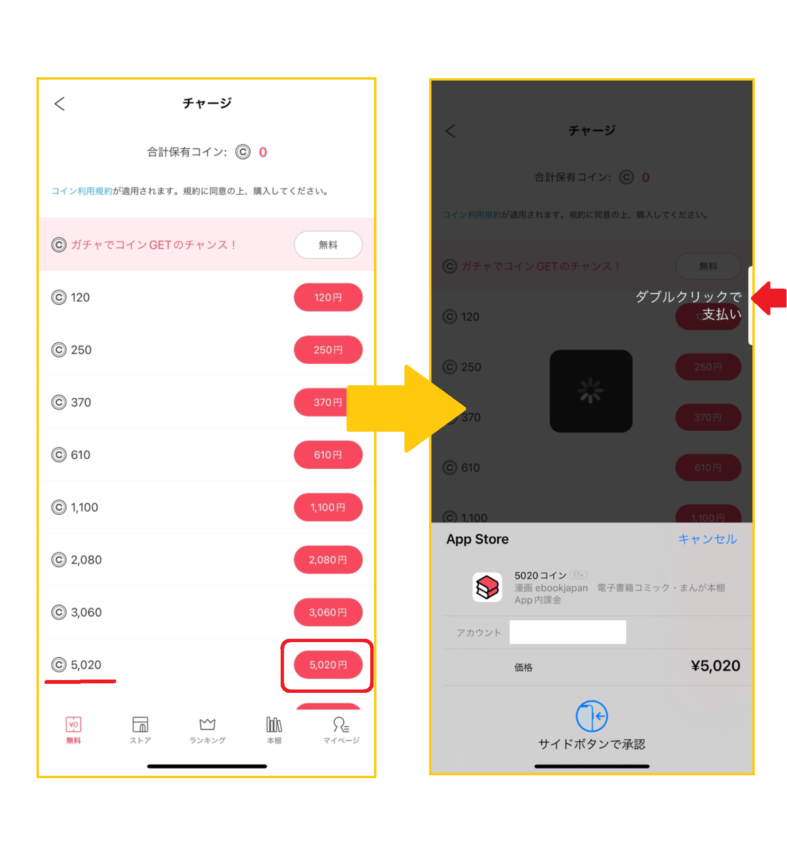 あとは機種の支払い方法に従って購入を完了させます。購入したい本のコイン数以上にコインを保有すれば、作品ページにある「©418」ボタンからスムーズに本を購入することができます。