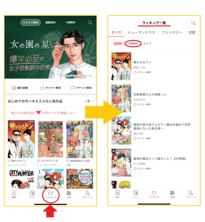 アプリを開いたときに下にある「ランキング」をタップします。すると、ランキング一覧が表示されます。「話無料」の作品が表示されているので、「1冊無料」をタップすれば、1冊無料作品のランキングが表示されます。