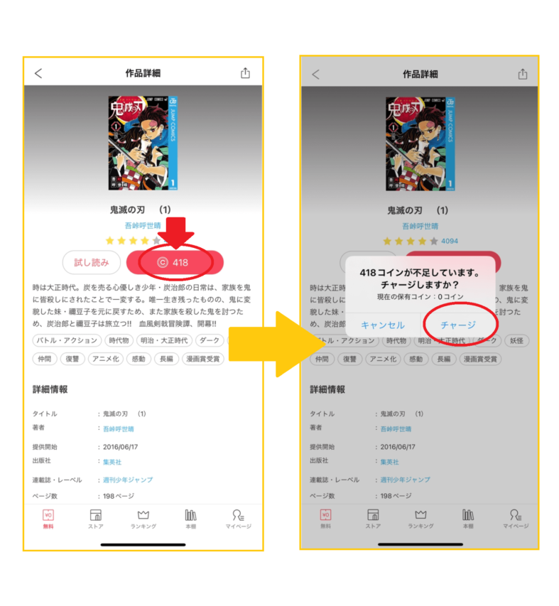 アプリ版から本を購入する場合、作品ページにあるコイン数が書かれたボタンをタップし本を購入することができます。この場合「©418」のボタンをタップします。