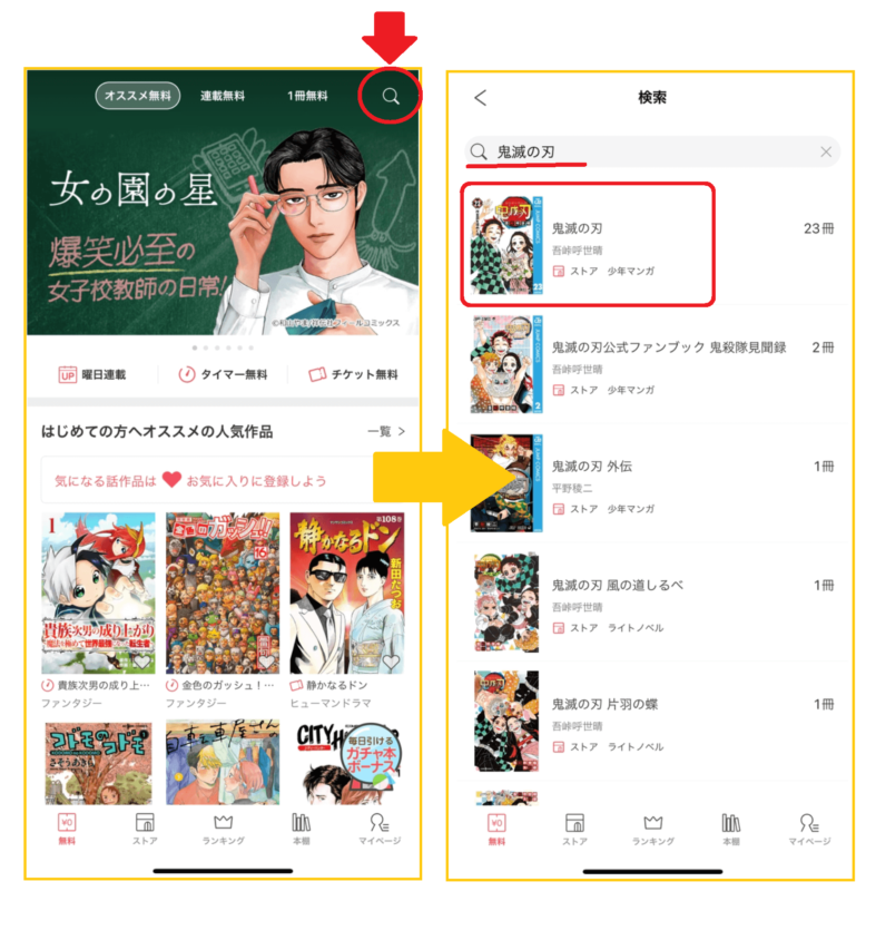アプリ版から有料作品を探す場合、アプリトップページ右上にある検索マークをタップし、検索バーに作品タイトルを入力します。