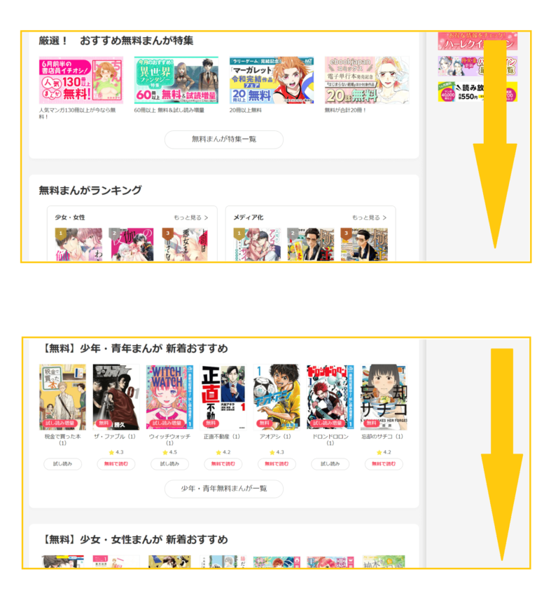 無料まんがのページには無料で読める作品がずらりと並んでいます。下にスクロールしていくと、無料まんがランキングや、少年・少女まんがなどジャンル別のおすすめまんがが表示されています。