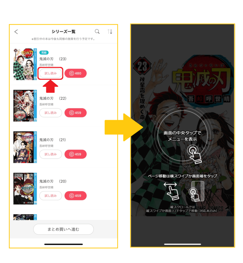 アプリ版で試し読みをする方法は、作品のページにある読みたい巻の「試し読み」をタップします。