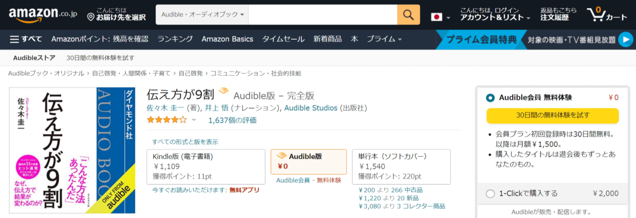 オーディブルの本は1冊1,000~2,000円程度するものが多く、月額1,500円の会員プランになる方が、お得にオーディブルを楽しめておすすめです。