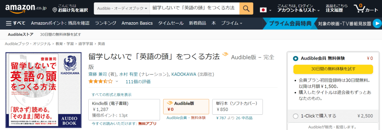 Audibleで「留学しないで「英語の頭」をつくる方法」を聴く