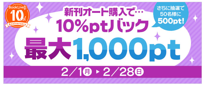 2月1日(月)~28(日)の期間中、新刊オート購入に登録して購入するとブックライブポイントが10%還元されます。(最大500pt)さらに5冊以上新刊オート購入した人の中から、抽選で100名に500ptプレゼント!最大1,000ptプレゼントのチャンスです。