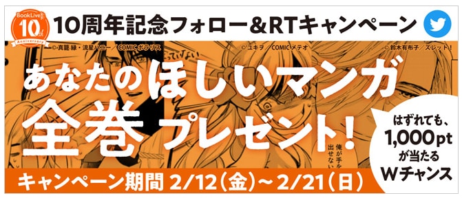 2月12日(金)~21(日)の期間中、ブックライブ公式Twitterアカウントのフォローと該当投稿のリツイートで、抽選で10名に好きなマンガ作品全巻プレゼント!さらに抽選で100名に1000円分のブックライブポイントが当たるWチャンス企画です。