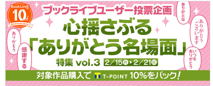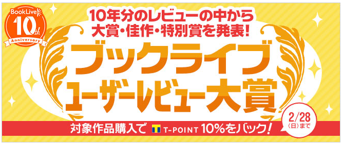 ブックライブ公式サイトでは、10年間で寄せられたユーザーレビューの中から大賞・佳作・特別賞を発表しています。2月17日(水)~28(日)の期間中、対象作品購入でTポイント10%還元!