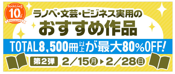 2月1日(月)~28(日)の期間中、小説・ラノベ・ビジネス書といった8500以上の対象作品が最大80%OFFになります。