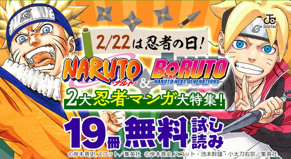 電子書籍サイトのeBookJapanでは、2月22日を”忍者の日”として掲げて、サイト内では『NARUTO-ナルト-』と『BORUTO-ボルト-』の2大忍者マンガ特集が組まれています。その特集の中で、NARUTOとBORUTOが無料で読めます。