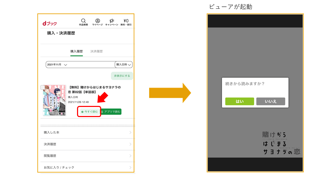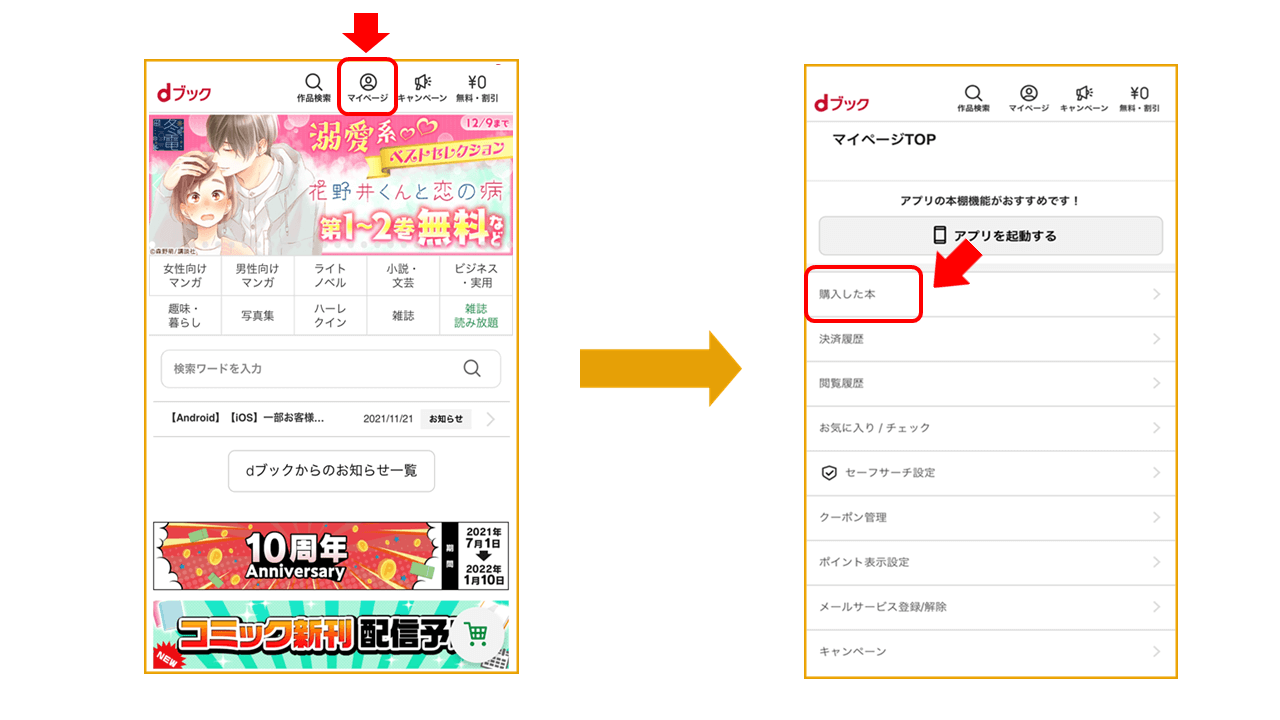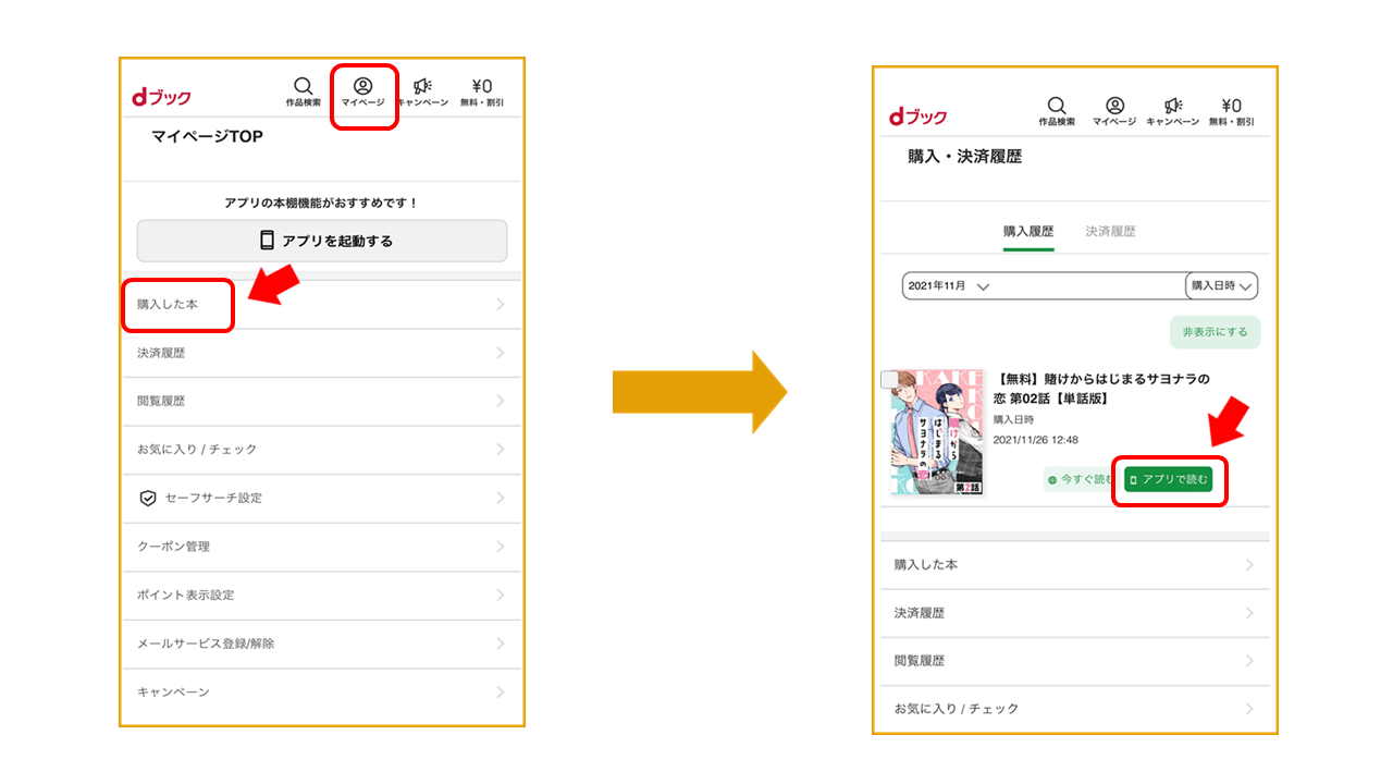 また、別の方法としては、上記と同じように「マイページ」「購入した本」の順に進み、「アプリで読む」をタップする方法があります。