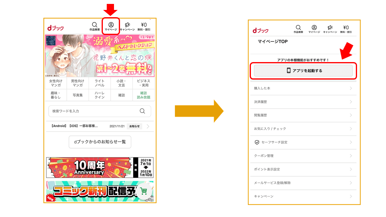 アプリで読む場合、公式サイトからアプリを開くには、先ほど紹介した「マイページ」内の「アプリを起動する」でアプリに行く方法があります。