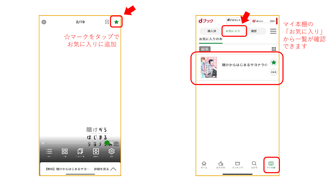 気に入った本は商品詳細ページの「お気に入り」ボタンをタップすると、「マイページ」や「マイ本棚」からすぐに閲覧できます。