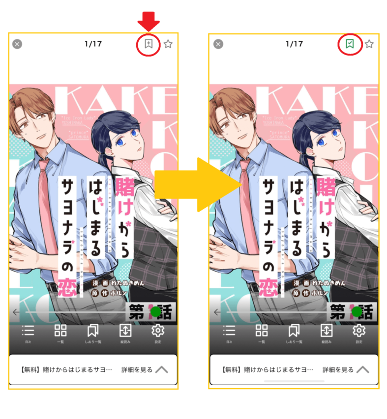 「しおり」はビューア画面の右上にある「しおり」マークをタップすれば、しおりが付きます。