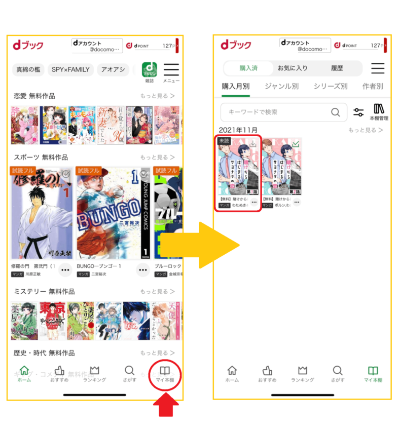 dブックでは、dアカウントに紐付く情報で購入情報が管理されており、マイ本棚や購入作品等は、ログインしたdアカウントに紐付いた情報のみが表示される仕様になっています。