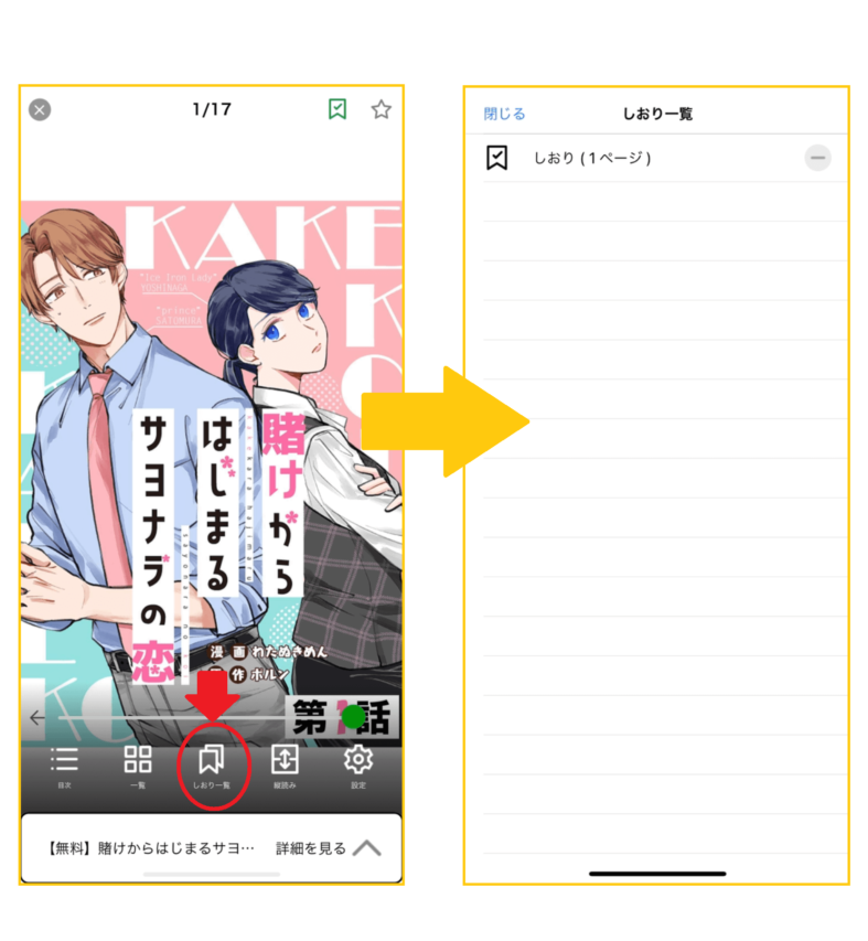 読みかけの本もしおりをつけておけば、ビューアメニュー下にある「しおり一覧」からすぐに確認ができ便利ですよ。