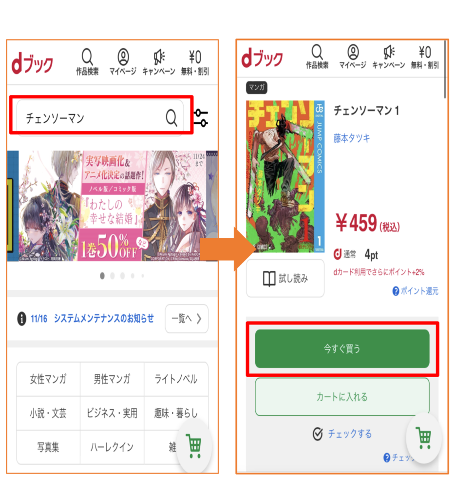 トップページまたは作品検索より購入したい作品名を検索、「今すぐ買う」ボタンを押します。