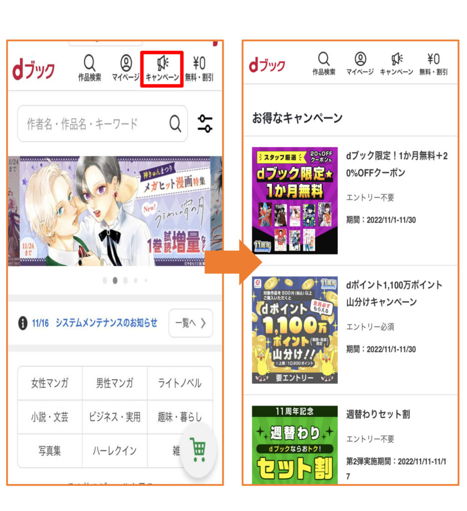 クーポンを使って購入する場合の使い方は、まずキャンペーンページよりクーポンを取得します。dブックのトップページの上の方にあるキャンペーンボタンを押して、キャンペーンページに進んでください。
