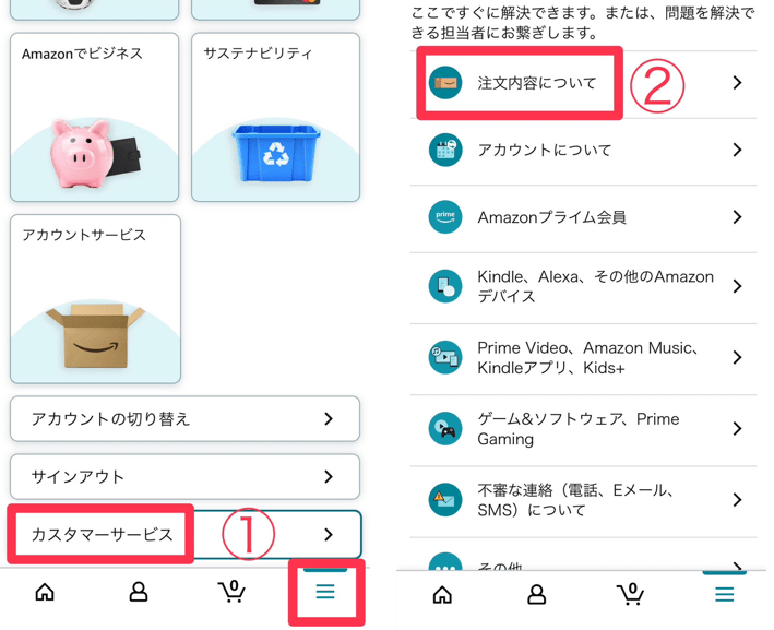 Amazonのショッピングアプリを使っている場合はアプリを開きましょう。アプリの右下の「≡」から「アカウントサービス」をタップします。