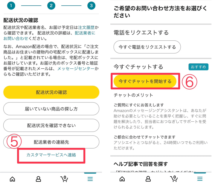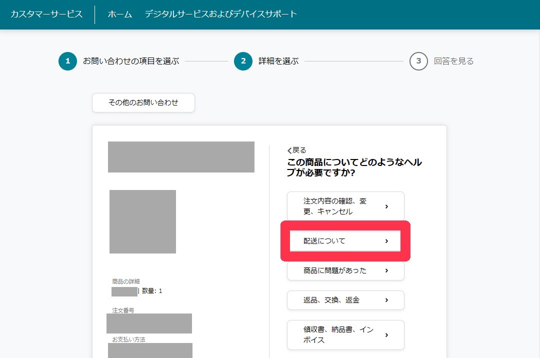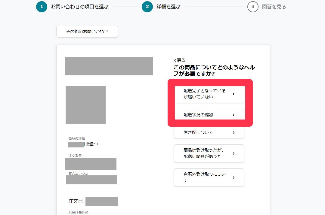 「届いていない」または、「配送状況の確認」からカスタマーサービスへ連絡ができます。
