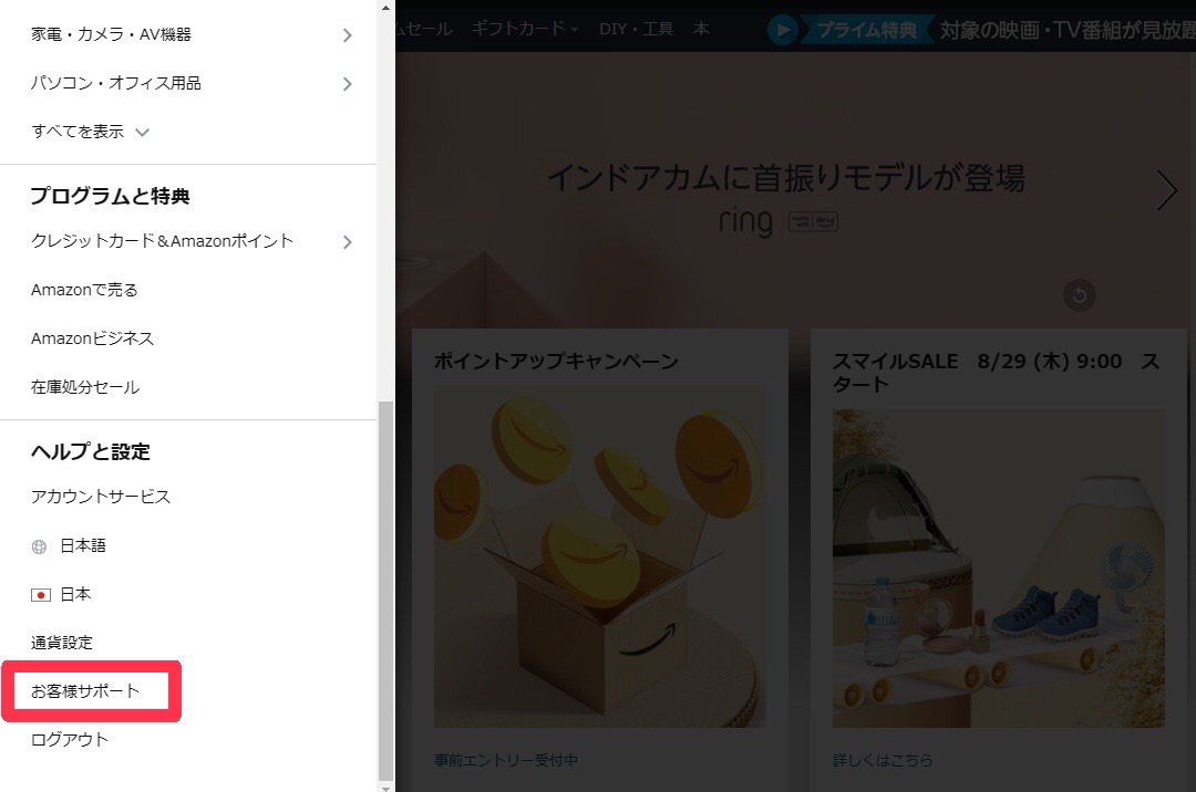 PCサイトの左上メニューの「≡すべて」から「お客様サポート」を選択します。