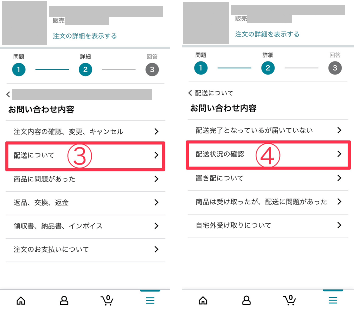 2.注文履歴→配送状況を確認に表示されている業者に連絡をする