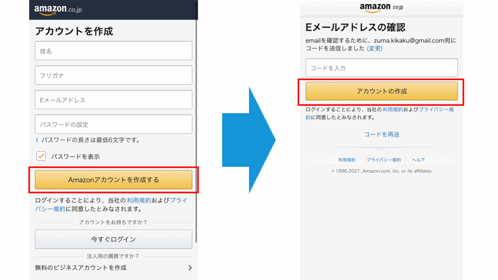 [Amazonアカウントを作成する]をクリックし、登録したメールアドレスに送られる確認コードを入力します。