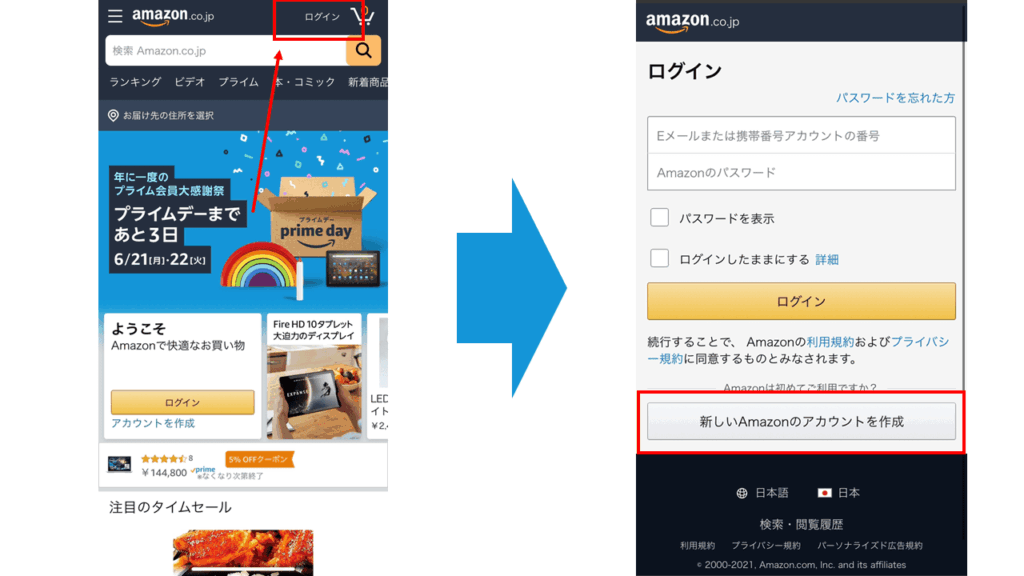 ではここからAmazonの会員登録の方法ーつまり、Amazonアカウントの作成方法についてみていきましょう。