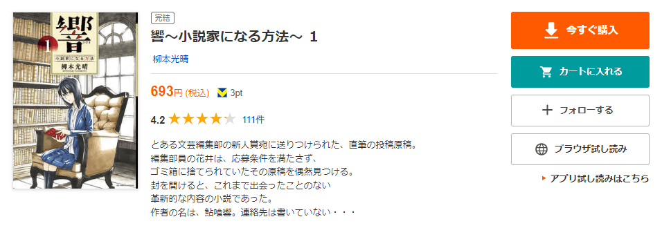 『響~小説家になる方法~』は、文芸業界をテーマとした漫画です。文芸業界が不況の中、新人賞応募条件を満たしていないものの、圧倒的な才能を持つ15歳の少女・鮎喰響が突如現れるところからストーリーが展開されます。