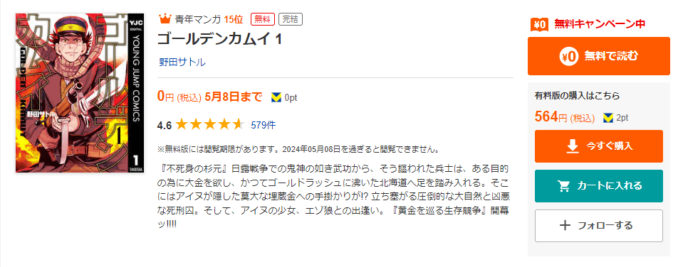“不死身の杉元”と恐れられた元兵士と、アイヌに住む少女のアシリパが、それぞれの目的のために共に行動しながら埋蔵金を探す旅に出かけるストーリーとなっています。