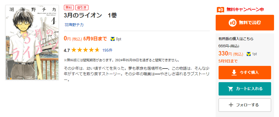 将棋をテーマにした漫画で、とある事情で一人暮をしているプロ棋士の男子高校生・桐山零が不器用ながら人と関わる様子が描かれています。