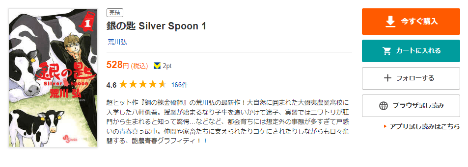 2012年のマンガ大賞受賞作品は、『銀の匙 Silver Spoon』でした。
