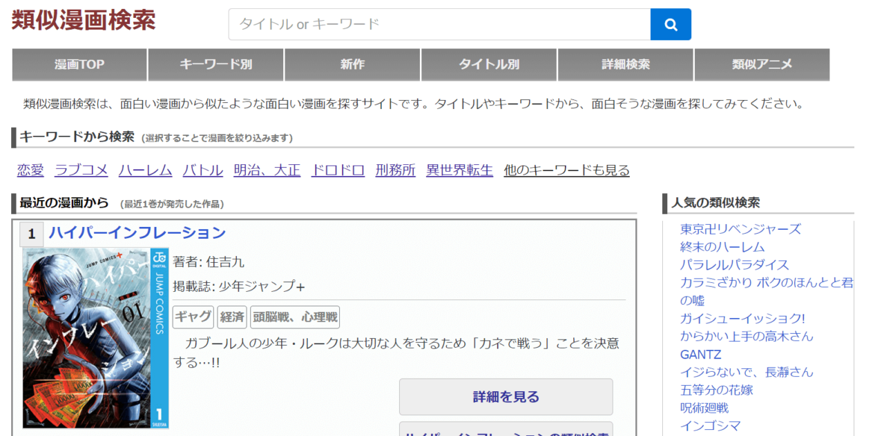 「類似漫画検索機能」とは、漫画を検索できるだけでなく、さらに似たような面白い漫画も探せるWebサイトです。検索した漫画と類似している作品を提案してくれるのが最大の特徴。