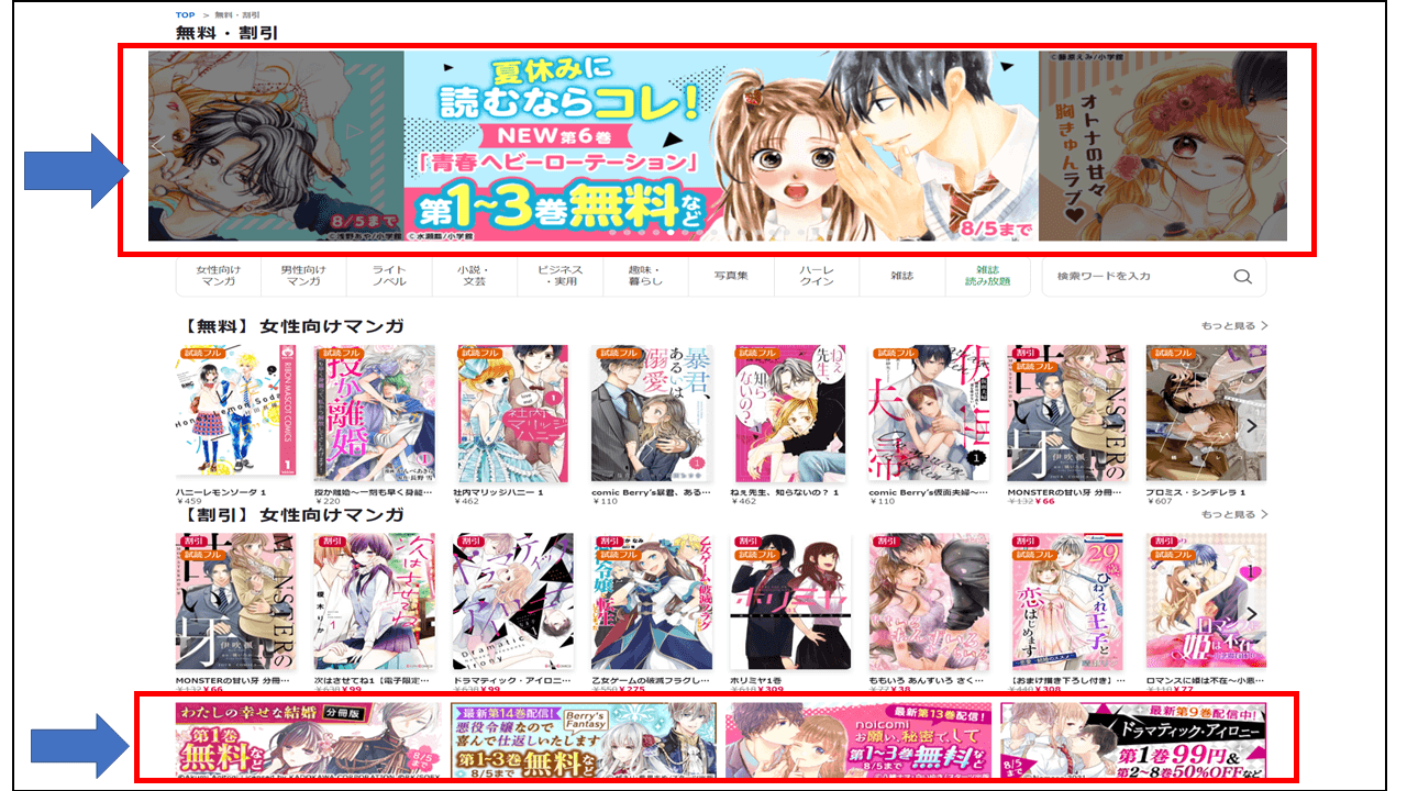 1冊ずつ表紙が並んでいるものに関しては、少し見つけにくいかもしれません。まずは、上部や中間に掲載されている、一押しのセールから確認してみることをおすすめします。