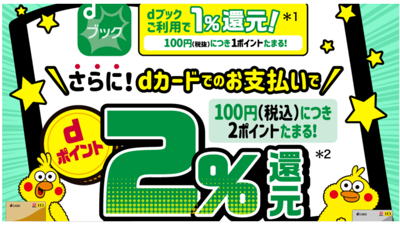 dブックで本を購入する際、支払いをdカードで行うと、通常1%の還元率が→2%になります!