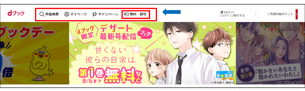 dブックで実施されているセールは、サイトのトップページの上部にある「無料・割引」から確認できます。先ほど紹介した「キャンペーン」ボタンの右隣にあります。