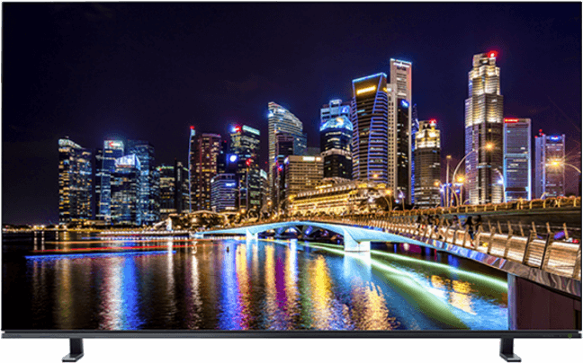 こちらは8Kの技術を応用した、鮮やかで高精細な4K映像を視聴できるスマートテレビです。パネルには低反射素材を採用し、映り込みや反射が抑えられています。画面が見やすく、映像に集中できるのが魅力です。