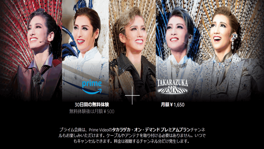Amazonプライム・ビデオであれば通常の月額料金600円(税込)に月額1,650円(税込)をプラスすることで、タカラヅカ・オン・デマンドの動画が見放題になるプレミアムプランが利用できます。